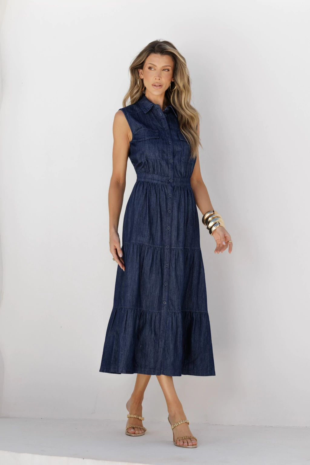 Vestido em denim com gola e pala pespontadas, recortes na altura do busto e bolsos chapados com lapela. A saia conta com dois recortes franzidos e pesponto aparente, além de pala nas costas com franzido. Fechamento frontal por botões.